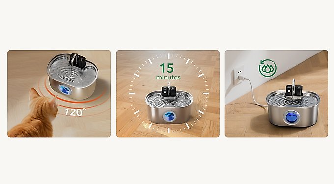 Features 3 water flow modes—sensor, timed, and continuous—to suit any pet’s drinking habits. Durable stainless steel ensures clean, quiet, and reliable hydration, even when you're away.