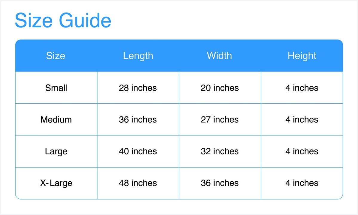 | X-Large | 48 inches | 36 inches | 4 inches |