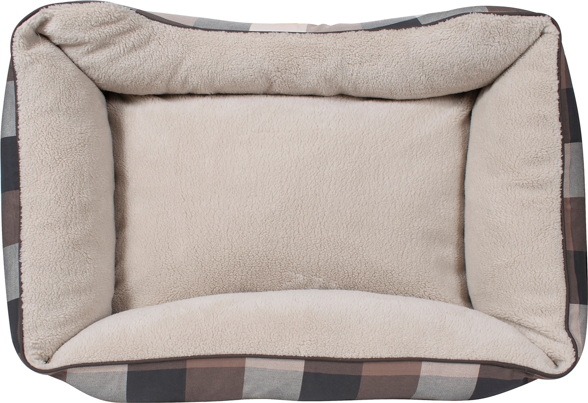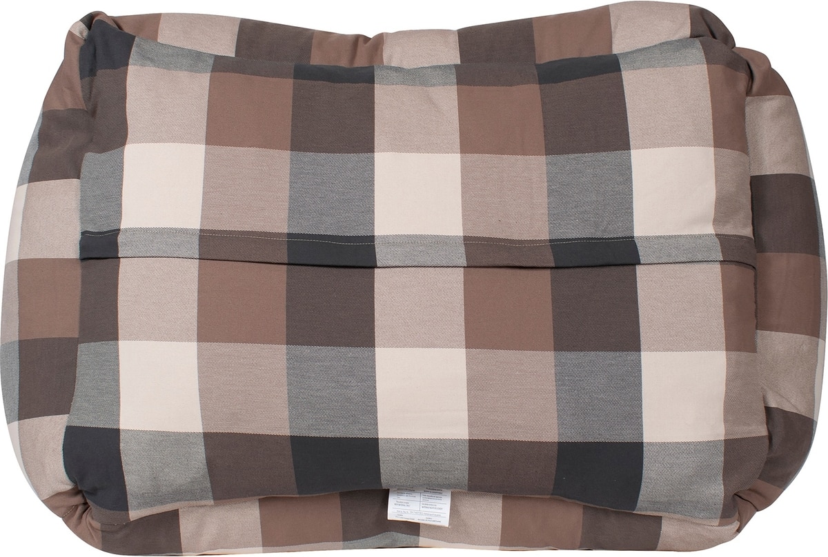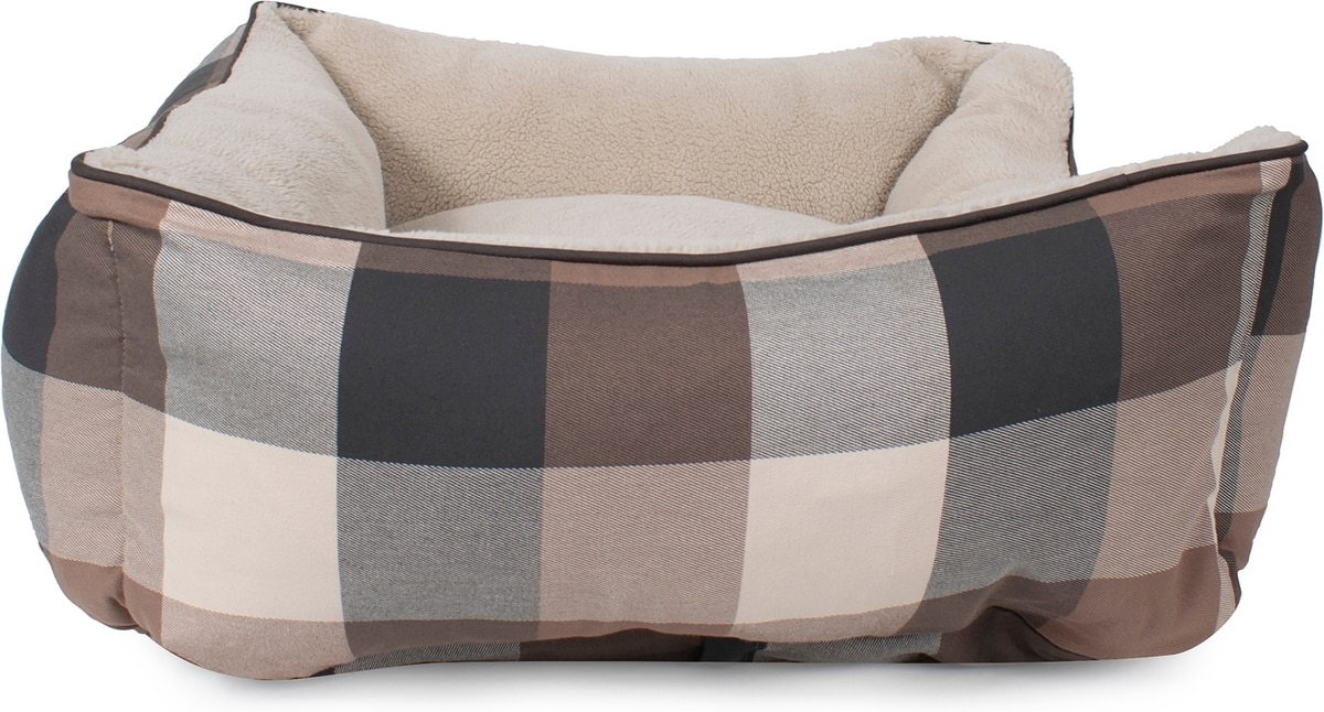 - This dog bed features a classic black and tan plaid design.