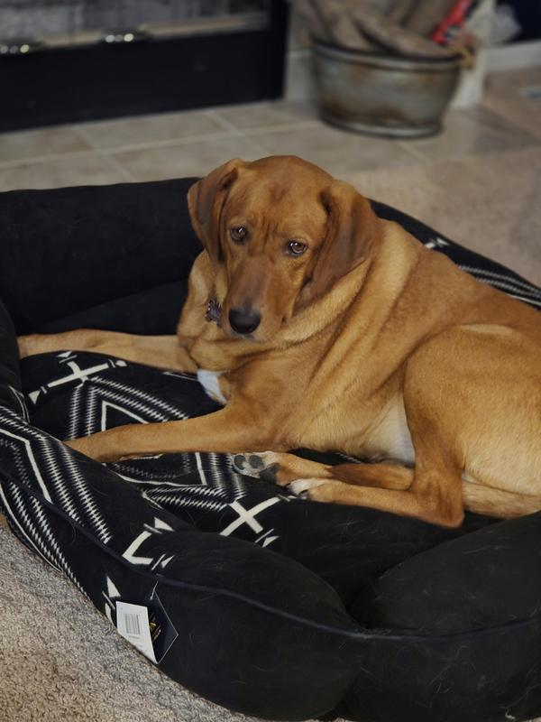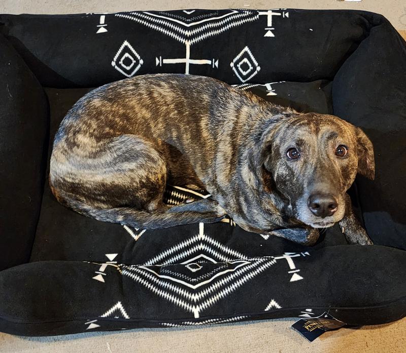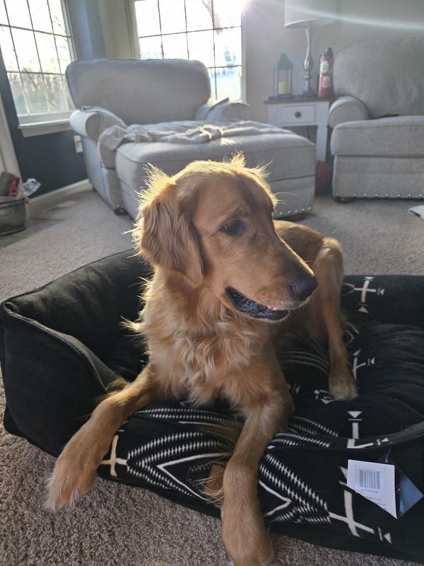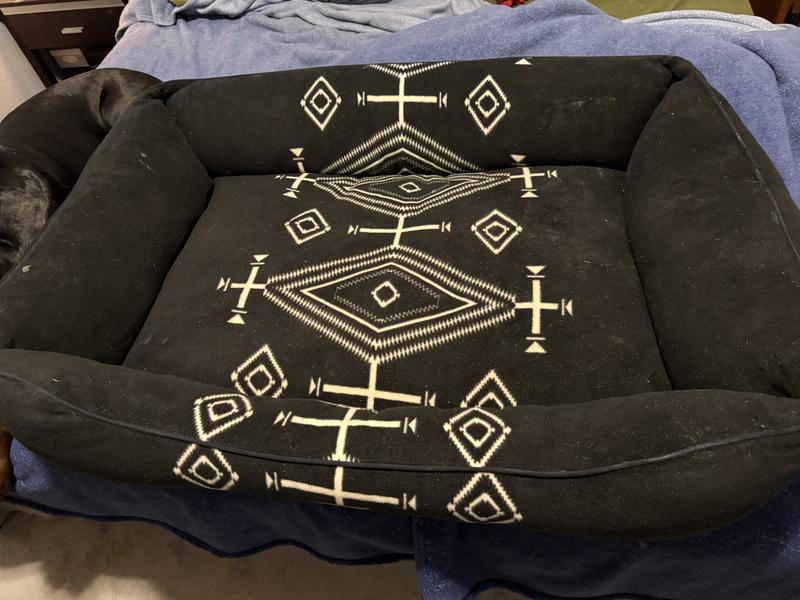 This bed is not only beautiful, but it is also huge and very thickly padded! I love the black and white color scheme with a western type print that would blend with a lot of decor styles. It is a soft fleece like material and has a zip off cover for easy cleaning.