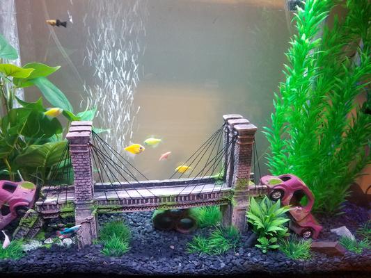 Looked everywhere for a "wow" centerpiece to form my tank around. I'm very picky and didn't want the typical fish tank look. Came across this and with no reviews, I wasn't sure what to expect. So far I'm happy and so are my fish and snails!!! Craftmanship is decent (only complaint so far is some of the paint job is sloppy around road lines) , but overall very pleased. Didn't have sharp edges which was very nice, as I'm normally having to file down ornaments prior to putting in my tank. Hopefully the strings on the bridge hold up. My tank size is 55 gal for reference on size. Feels sturdy. *** I'll update review couple months in to rate durability. Happy Memorial Day 2021!