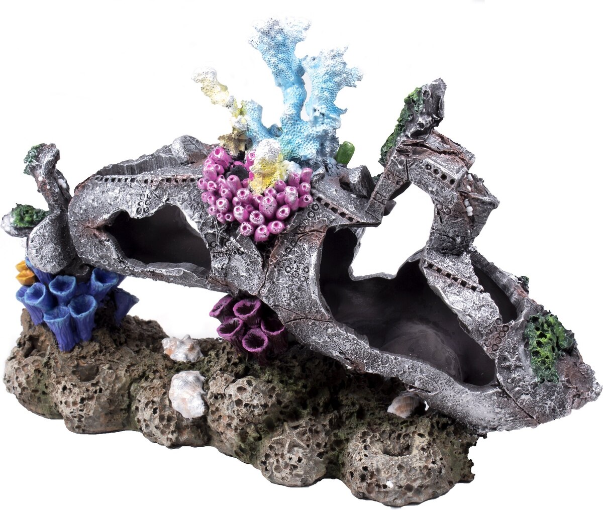 Great decoration. We keep it in our reef tank where it sits as part of a rock structure, is a home to our peppermint shrimp, and is now nearly covered in mushroom corals. I added an image with the submarine on the left side, hard to see, but it looks like a natural part of the ecosystem!