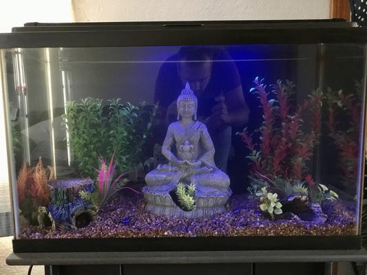 Looks better in person. The pictures don't do it justice. This is a very large ornament. I was not expecting it to be so big but wow it looks great in my 55 Gallon. This Buddha is highly detailed and doesn't have any sharp or rough areas that can potentially harm a fish. Holes are large enough for larger fish to enter and exit. There is another hole in the rear so don't place it completely flush with the back of your talk. I left about a 2 inch gap. If you're looking for a Buddha decoration for your tank. Look no further. Obviously I'm quite impressed