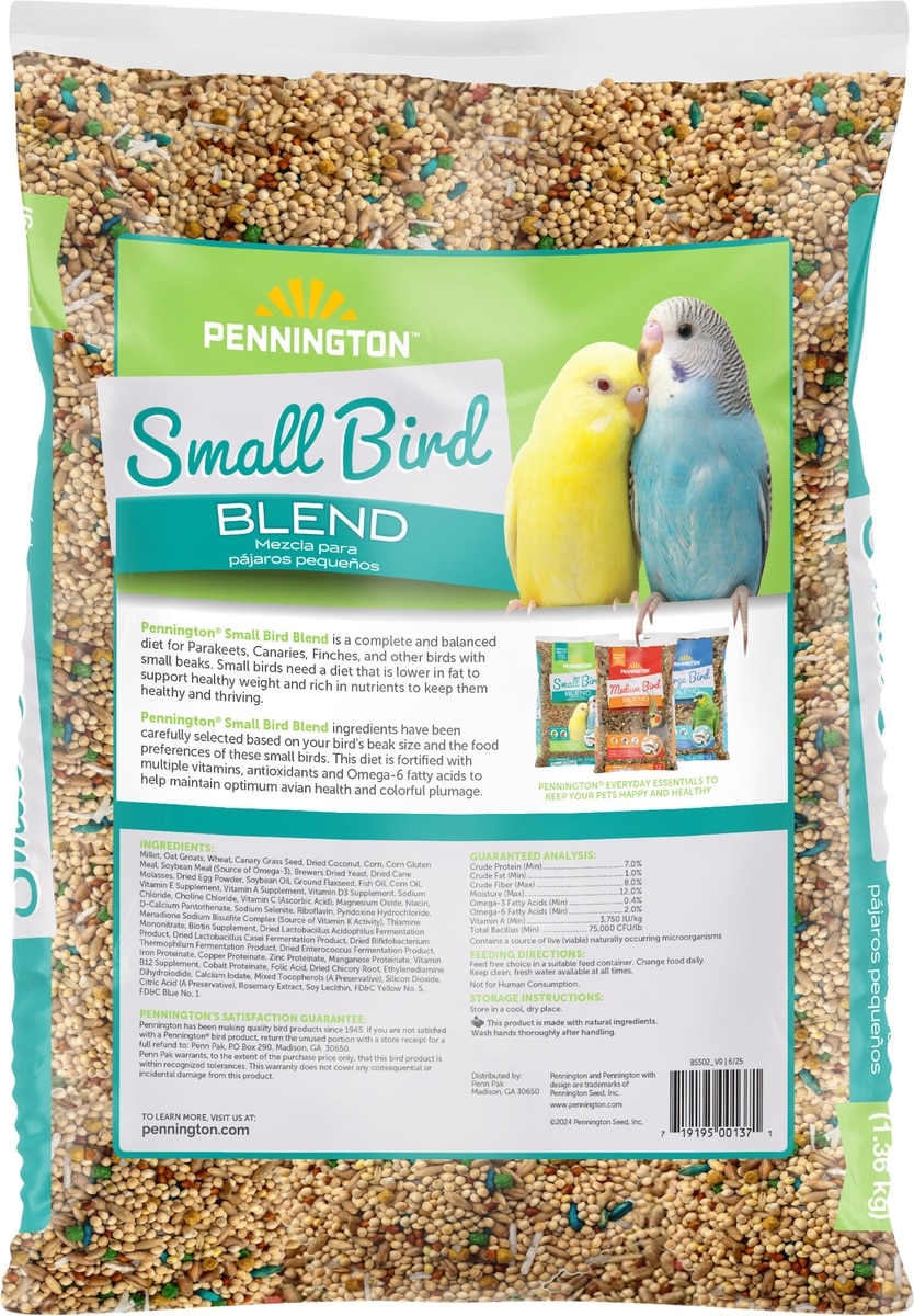Millet, Wheat, Milo, Canary Grass Seed, Oat Groats, Corn, Peanuts, Sunflower Seed, Corn, Corn Gluten Meal, Soybean Meal, Brewers Dried Yeast, Dried Molasses, Dried Egg Product, Soybean Oil, Fish Oil, Corn Oil, Flaxseed Meal, Soybean Meal, Dried Cane Molasses, Brewers Dried Yeast, Dried Egg Product, Ground Flaxseed, Salt, L-Lysine Monohydrochloride, DL-Methionine, Vitamin E Supplement, Vitamin A Supplement, Vitamin D-3 Supplement, Sodium Chloride (Salt), Choline Chloride, Ascorbic Acid, Magnesium Oxide, Niacin, D-Calcium Pantothenate, Sodium Selenite, Riboflavin, Pyridoxine Hydrochloride, Menadione Sodium Bisulfite Complex (Source Of Vitamin K Activity), Thiamine Mononitrate, Biotin Supplement, Iron Proteinate, Copper Proteinate, Zinc Proteinate, Manganese Proteinate, Vitamin B-12 Supplement, Cobalt Proteinate, Folic Acid, Dried Lactobacillus Acidophilus Fermentation Product, Dried Lactobacillus Casei Fermentation Product, Dried Bifidobaterium Thermophilum Fermentation Product, Dried Enterococcus Fermentation Product, Chicory, Ethylenediamine Dihydroiodide, Calcium Iodate, Mixed Tocopherols, Silicon Dioxide, Flaxseed Oil, Citric Acid (A Preservative), Rosemary Extract, Lecithin, FD&C Colors (Red #3, Red #40, Yellow #5, Blue #1, Titanium Oxide, Artificial Flavor.