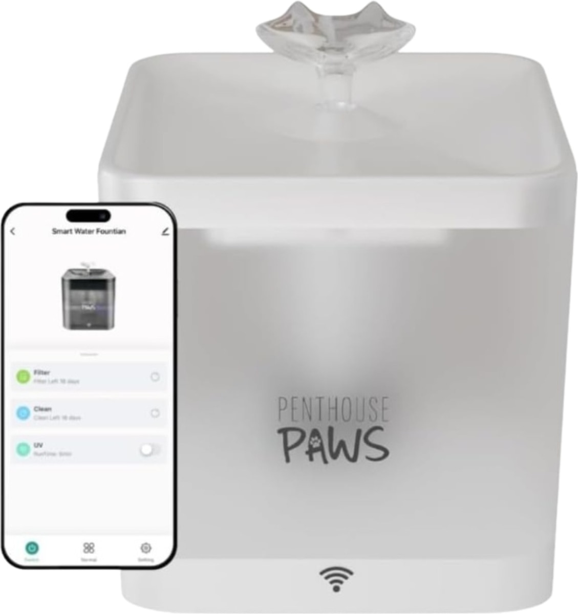 - Use the Penthouse Paws app to turn the fountain on or off or set schedules—whether you’re at home or on the go.