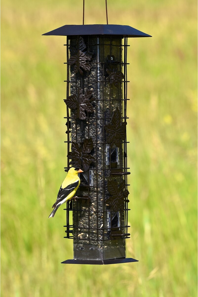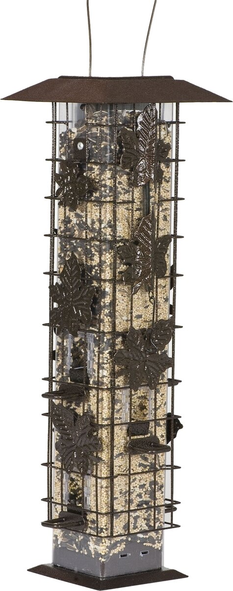 - The interior seed tower is surrounded by rustic metalwork and boasts a two-pound seed capacity.