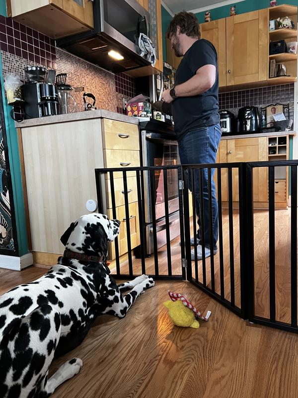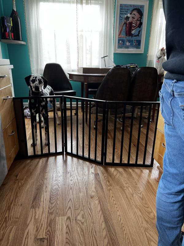 We have been looking for a gate of some kind to keep our dog out of the kitchen when we are cooking. This does the job well! Short enough for us to step over if needed, and long enough to span the width of the kitchen. Pretty lightweight and compact. Would be concerned if it wasn’t leaning up against our cabinets that the dog could potentially knock it over if he tried hard enough. Overall great product.