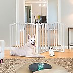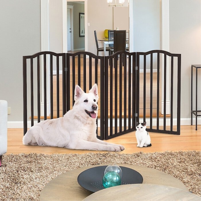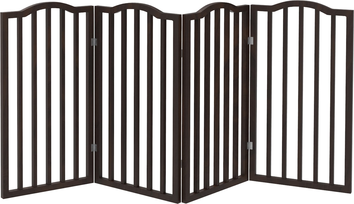 - 4-panel pet gate will confine your dog, cat or puppy while you are away and folds down for compact storage.