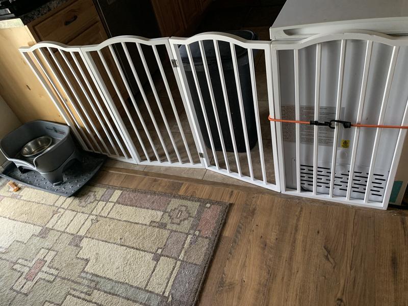We have three dogs to block out of kitchen during meal prep. It’s tall enough and easy to move-so we anchored to our freezer and put something against the hinge