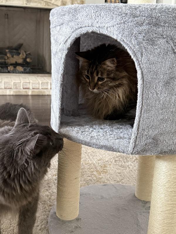 Immediate attraction to their new house! Cats instantly jumped on the tower and battled out of jealousy for the middle covered sleeping section! They love this thing!