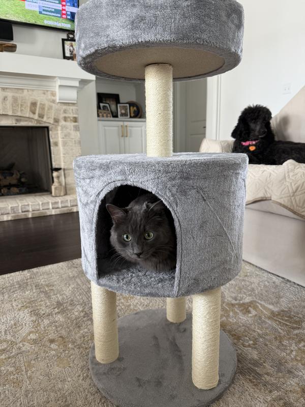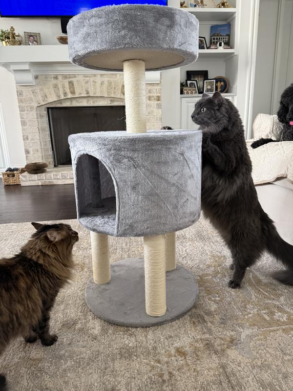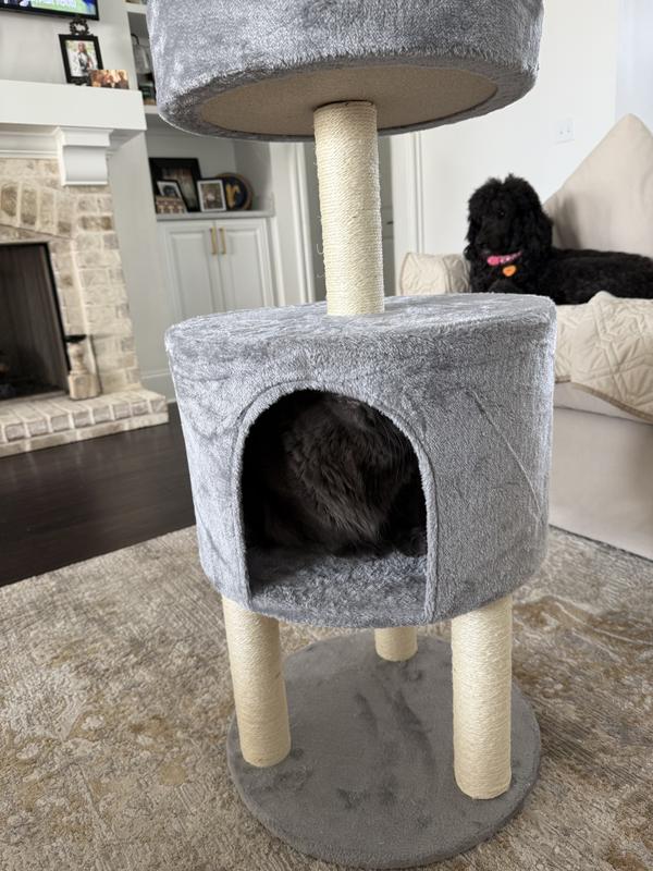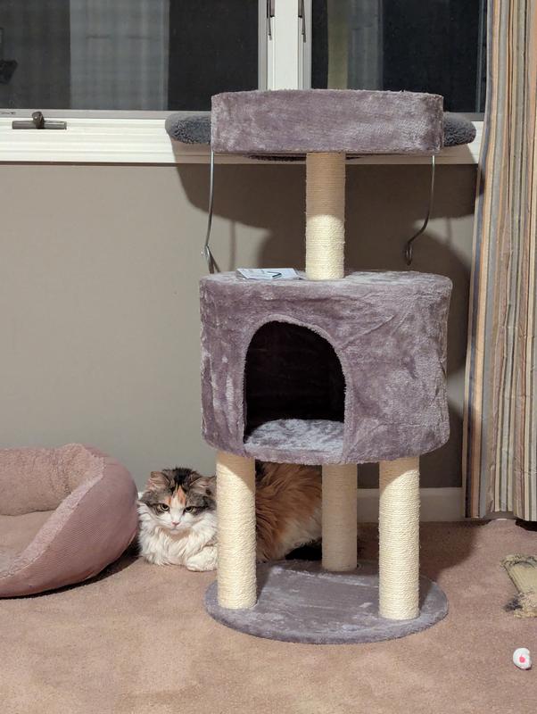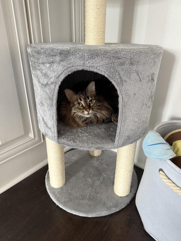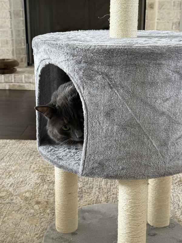 - Three lower and upper scratching posts wrapped in sisal rope provide a go-to spot for releasing energy or satisfying the urge to claw.
