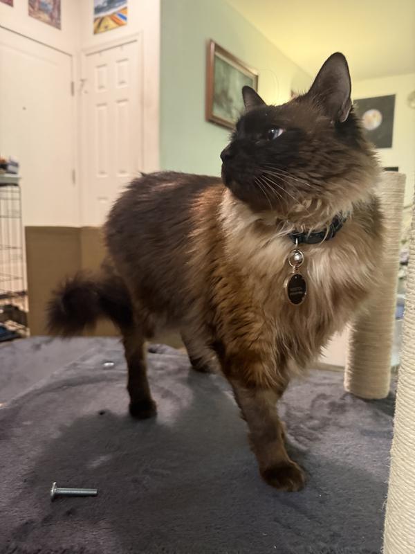 I really love this cat tower… It’s well-made and wasn’t too terribly difficult to put together. The only reason I didn’t give it five stars is the last screw was a B instead of an A. This made it too long and I am needing to go and find another one at the hardware store in order to complete the install properly