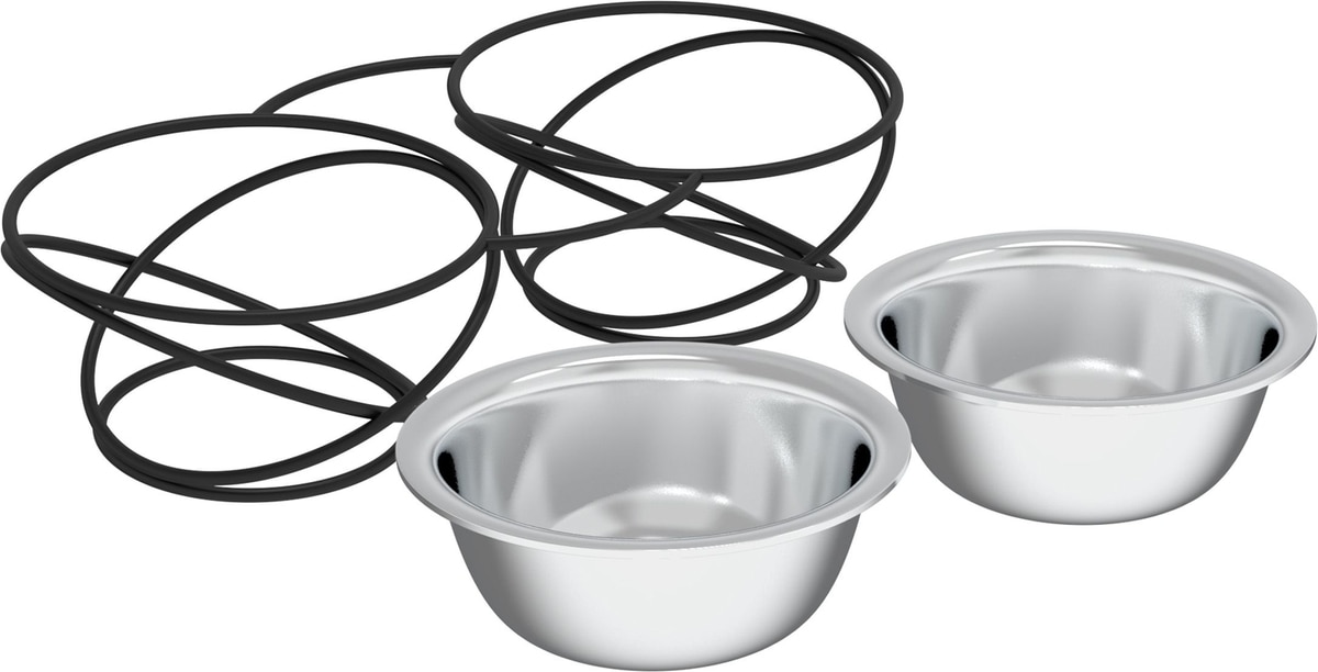 Dog food dishes on a stand
