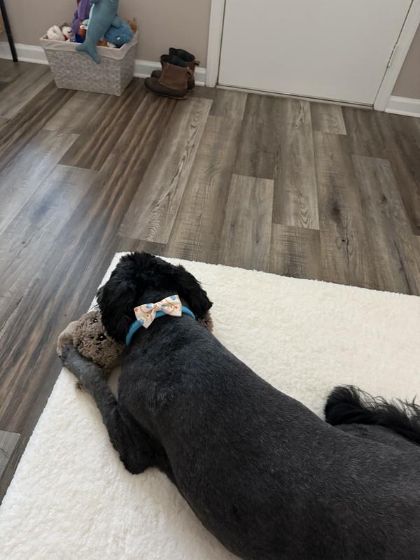 I had a smaller version of this bed for over a year and it’s held up very well under a number of washings. I guess I should have taken a measurement because this extra large bed is quite huge! I got it so when my 60 pound dog jumps off the couch she doesn’t slide on the tile. This bed stays put and protects her joints