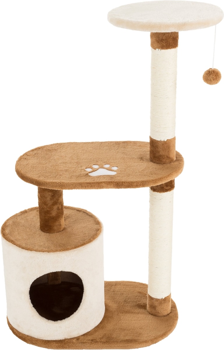 - Two levels of scratching posts wrapped in sisal rope provide a go-to spot for releasing energy or satisfying the urge to claw.