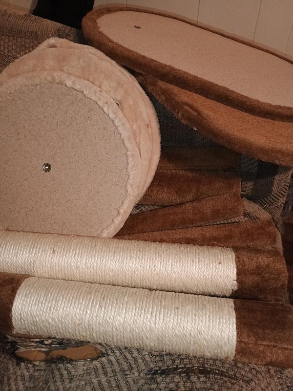 Easy to assemble, our 2 kittens, and our 2older cats love the scratching posts. Only issue was one of our kittens tore the hanging ball off the top post. No matter,