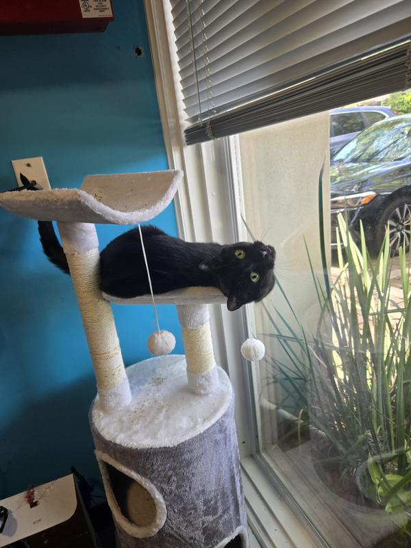- Two scratching posts wrapped in sisal rope provide a go-to spot for releasing energy or satisfying the urge to claw.