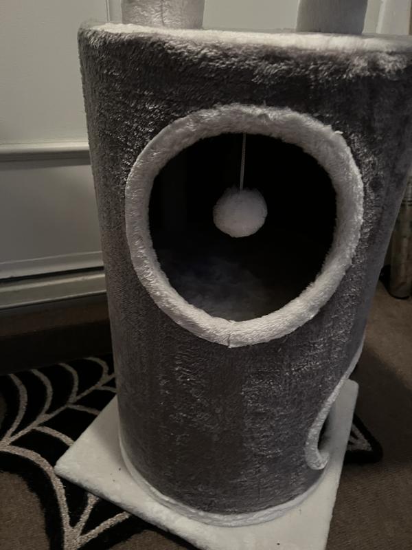 - A two-story, barrel-shaped kitty cave with 7.25-inch circle openings offers plenty of privacy for your pet to get away.