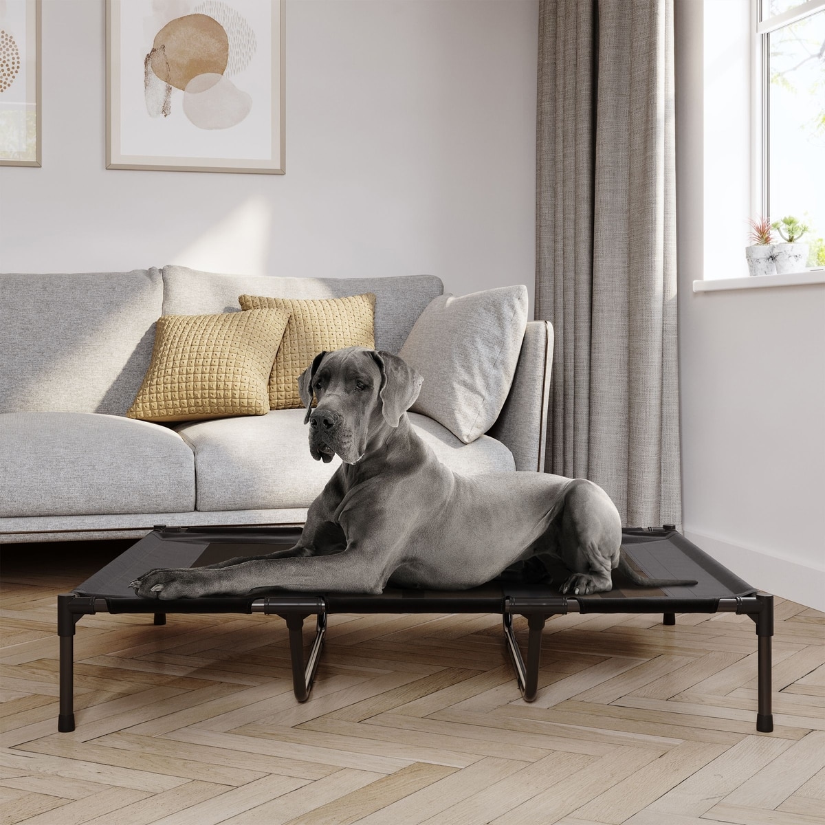 - Keeps your best friend off of the ground, cold floors, or hot pavement.