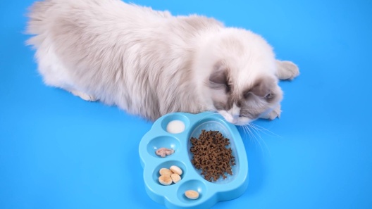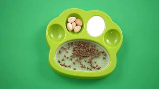 - Slow feeder bowl pairs with different types of food, including crunchy kibble and fresh veggies.