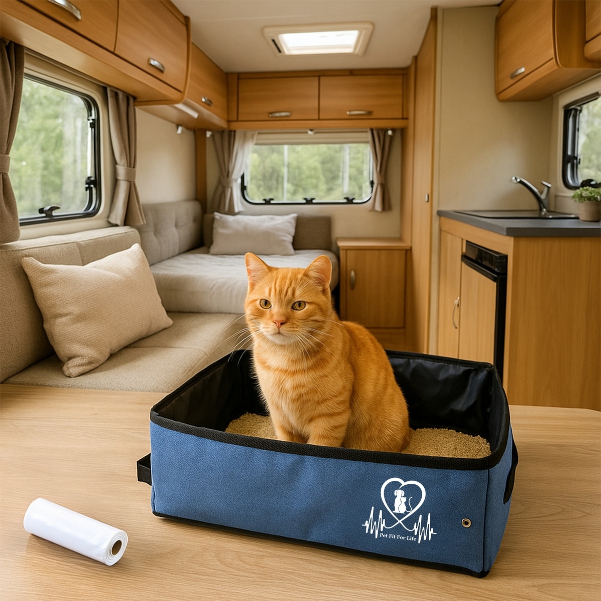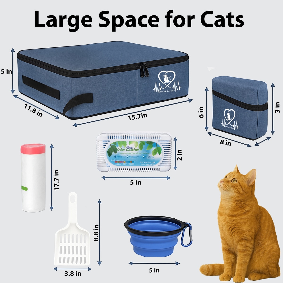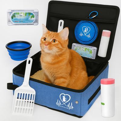 Complete all-in-one kit includes a medium-sized cat litter box with lid, zippered cover, fitted liner bags, odor catcher, litter scooper, and a collapsible water/food bowl.