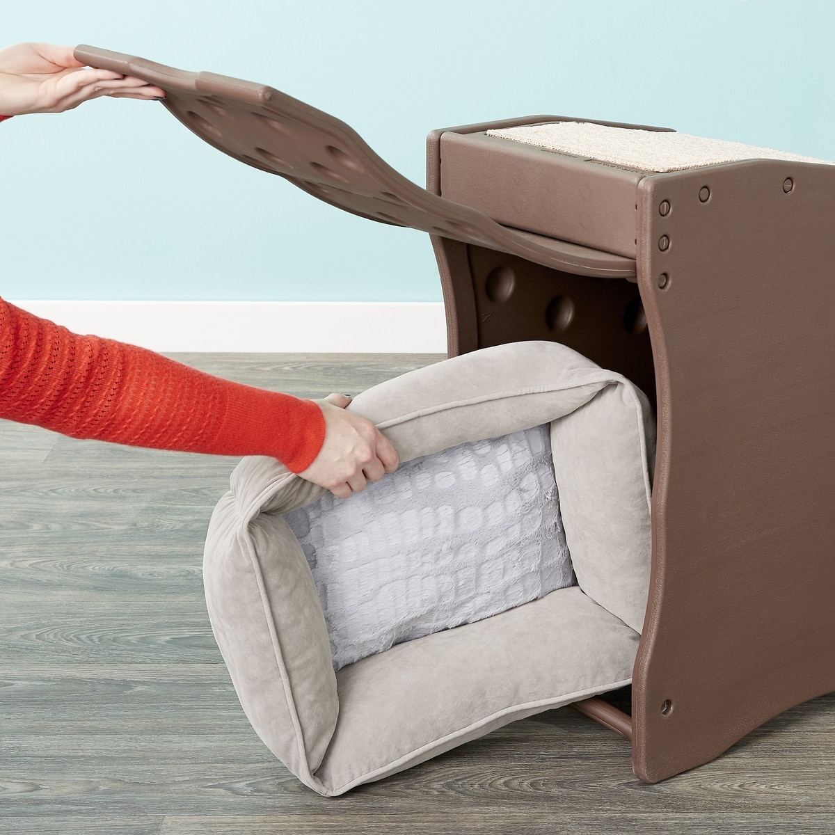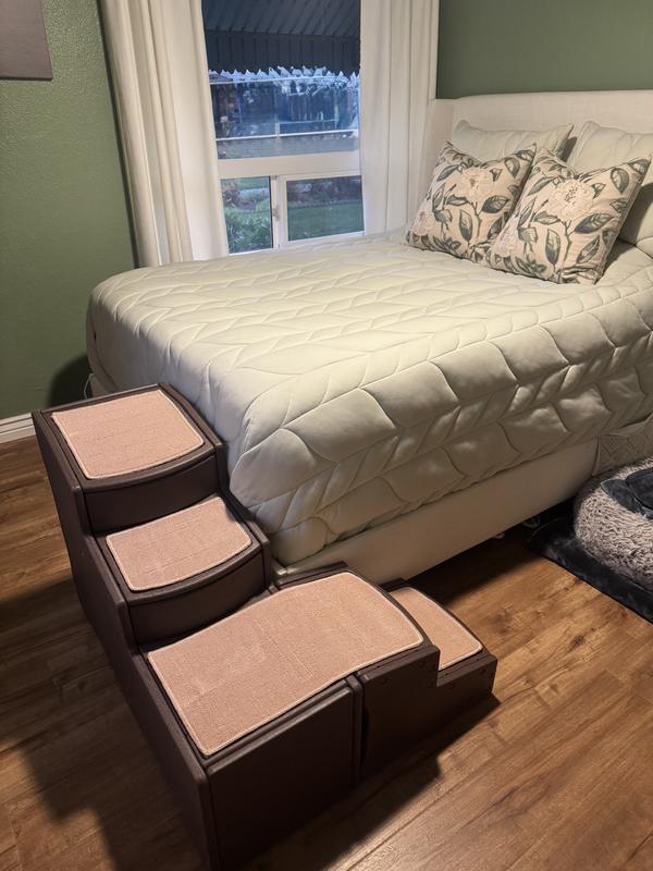 The Easy Step II Extra Wide Pet Stair has wide, deep steps that allow larger dogs to get their entire body onto each platform and comfortably climb the stairs. The innovative incline of each step reduces the number of stairs needed to climb up, reducing stress on your pet. The stair easily snaps together without any tools and features a removable, machine washable carpet tread for grip.