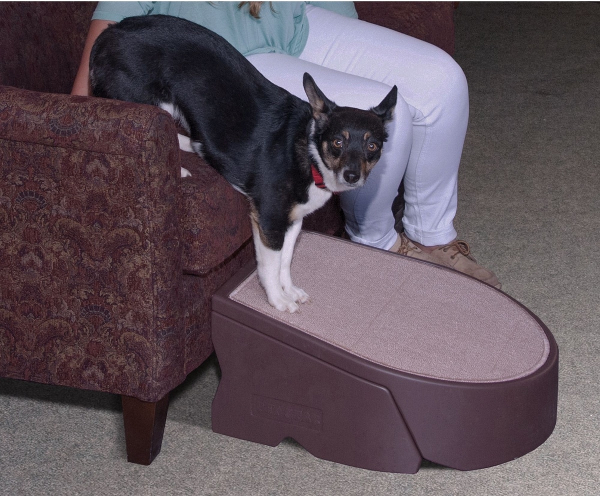 The Easy Step II Extra Wide Pet Stair has wide, deep steps that allow larger dogs to get their entire body onto each platform and comfortably climb the stairs. The innovative incline of each step reduces the number of stairs needed to climb up, reducing stress on your pet. The stair easily snaps together without any tools and features a removable, machine washable carpet tread for grip.