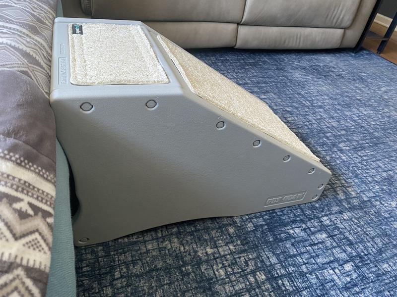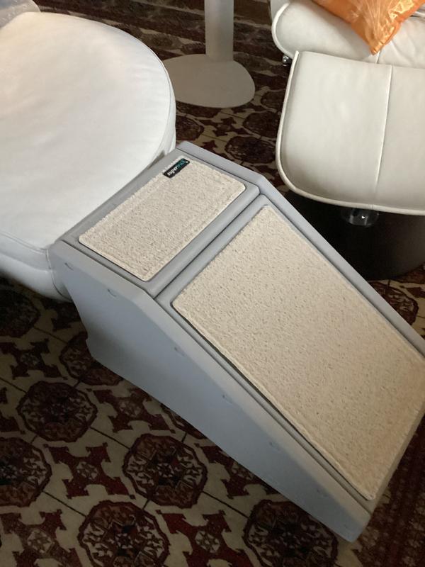 The Easy Step II Extra Wide Pet Stair has wide, deep steps that allow larger dogs to get their entire body onto each platform and comfortably climb the stairs. The innovative incline of each step reduces the number of stairs needed to climb up, reducing stress on your pet. The stair easily snaps together without any tools and features a removable, machine washable carpet tread for grip.