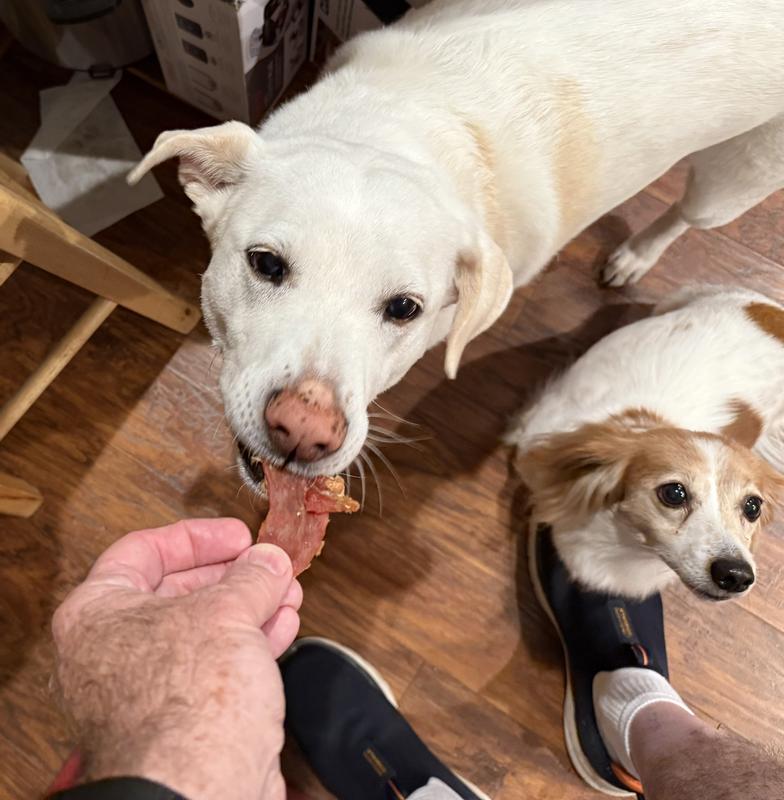 We like that these jerky treats have limited ingredients… but they are very hard and chewy. They are too hard to easily break into smaller pieces. Maybe they would be better for larger dogs? Some of the pieces are shape and shard like so I am nervous about giving them to my smaller pups especially my senior girl. These treats are for dogs who have all their teeth and chewing power, but then then I would just be cautious.