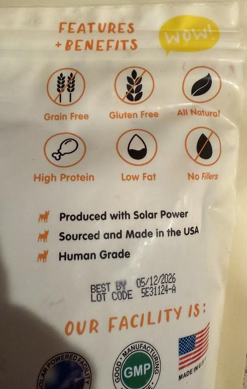 My Tibetan Mastiff is SUPER picky - turns up his nose at biscuits as well as other jerky. Not this time! I extended a piece of this chicken jerky.. and with a small sniff, there came the quick grab! The texture of the jerky is perfect - whole long pieces, not nuggets. The smell? Like actual chicken! Sebastian loved it! So much so that he now sniffs my pockets everytime I am near him. Also, it isn't an artificial color - natural chicken meat color - not edible for humans, of course.. but it did look like human grade!