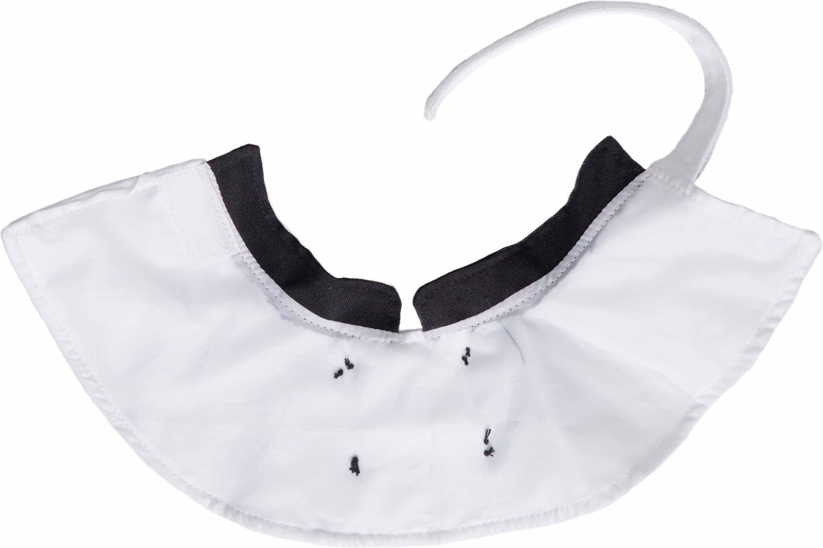 - Hat has an adjustable elastic strap, and collar has a hook and loop closure at the back of the neck.