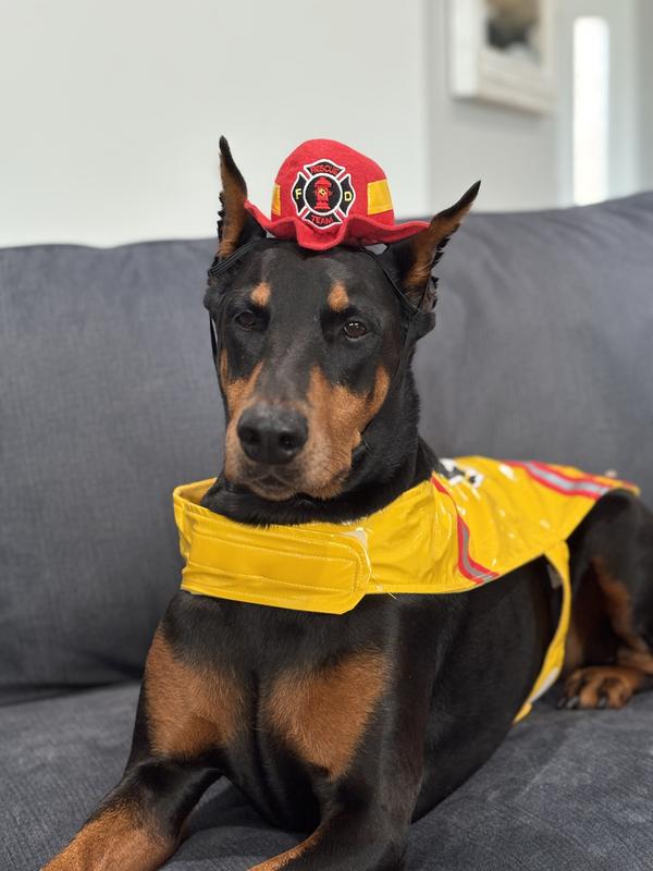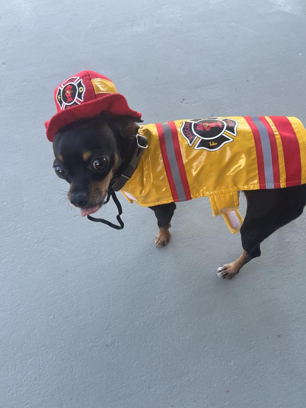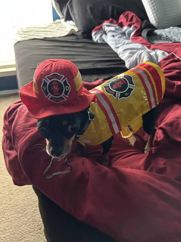 Our boy recently has taken a dislike to when the fire alarm goes off in the house due to my cooking (me too honestly), so we deemed him as the fire safety boy as he runs to the door every time it goes off. Naturally this is what we decided he should be for Halloween. The costume is great, he's a 26lb long boy but fits a large perfectly. Would definitely recommend!