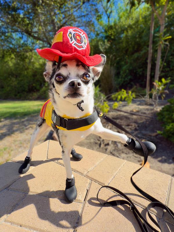 We had a bad wildfire this year and I thought it was a fitting costume for my little fire dog to join the ranks of the first responders to help fight fire with cuteness. Made well, good fit, I did have to add some double sided sticky tape as the strap below the neck was slightly too long but other than that it fit well and was easy to put on. The hat is super cute but I'd rather it not be closed on the head area and sit so high. I wish it were the same vinyl material as the jacket but other than that very pleased and hit around our area.