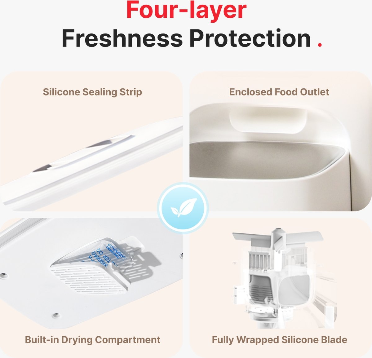 Fourfold protection lasts freshness for 30 days: builting-in drying compartment; silicone sealing strip; enclosed food outlet; fully wrapped silicone blade.