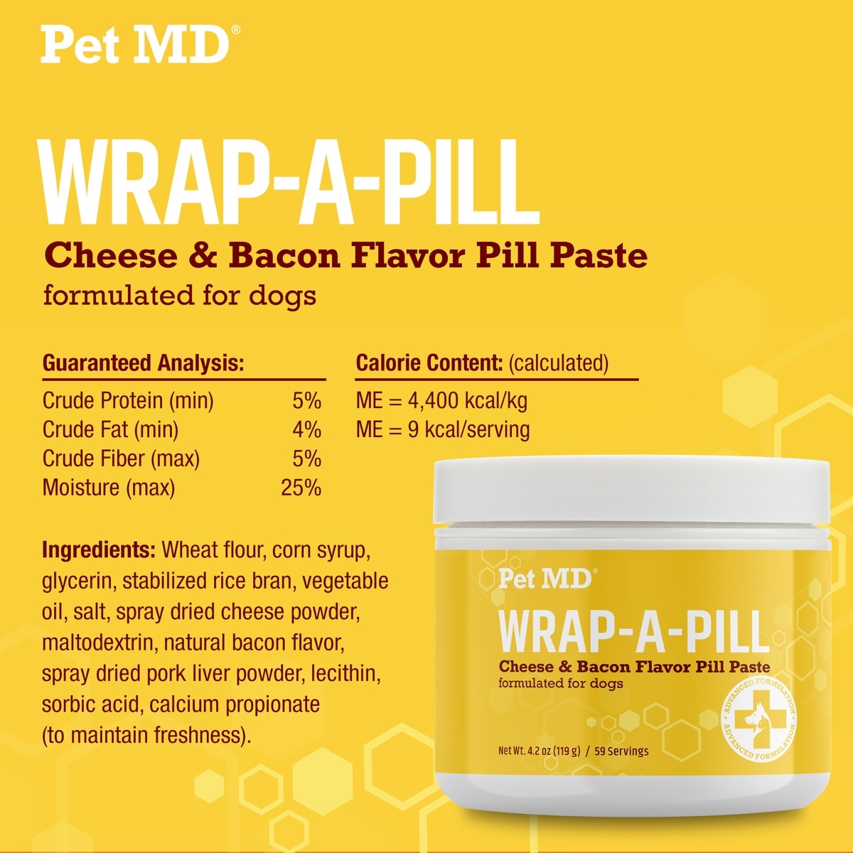 - Pet MD Wrap-A-Pill Bacon Flavor Pill Paste Dog & Cat Supplement, 4.2-oz tub$14.99 Chewy Price$16.99 List Price$14.24 Autoship PricePromo, New Customers Only: Spend $49+, Get $20 eGift Card +1 deal
