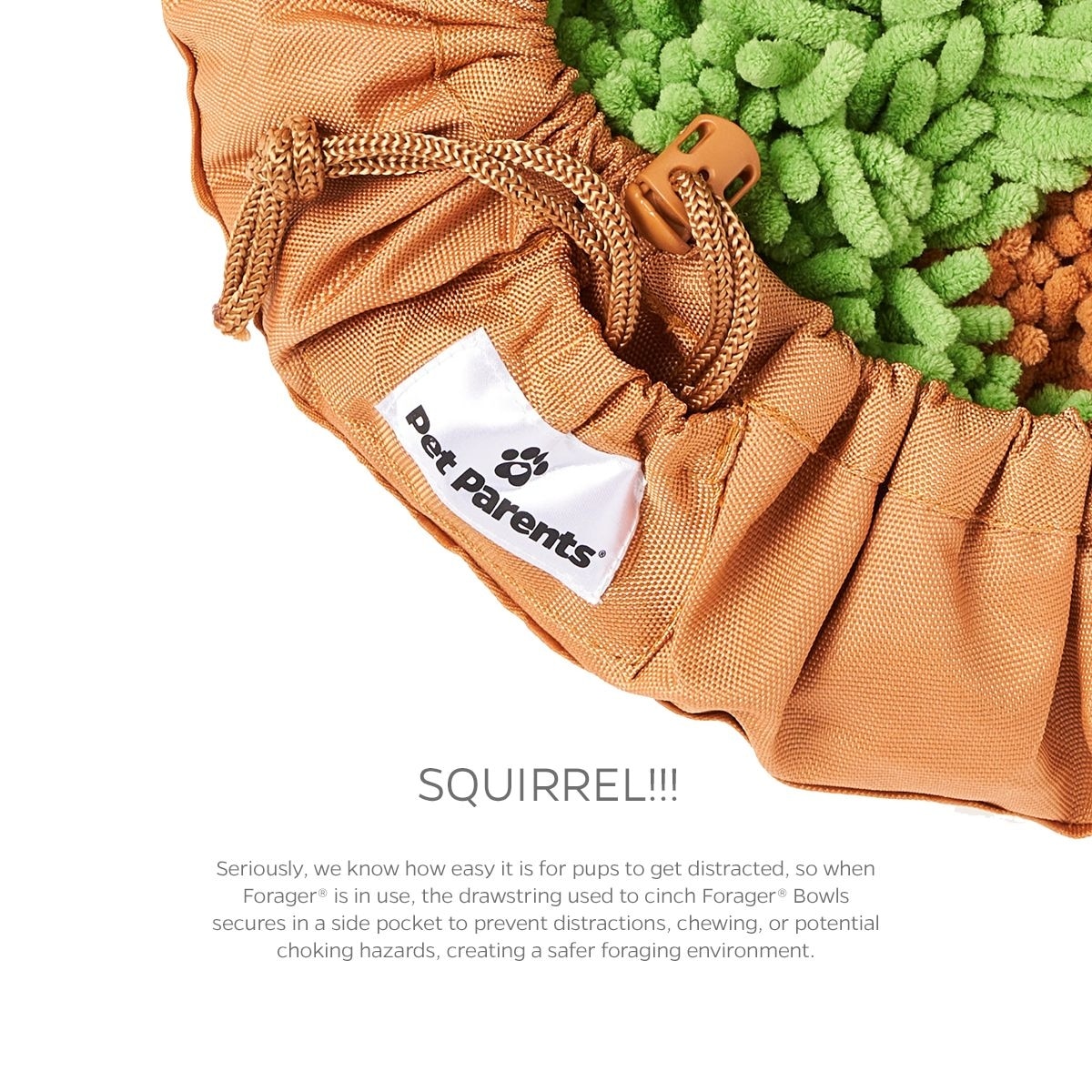Forager Mats and Bowls can roll or cinch up for easy storage or travel. You can tuck the Forager Bowl drawstring away into its side pocket or secure the Forager Mat strap under the mat for minimal distraction while your pup is foraging, too.