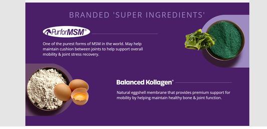 This supplement contains Branded 'Super Ingredients' that are clinically proven ingredients that go through a proprietary process. These ingredients increase efficacy & are more effective than commonly used basic forms of the ingredients. The manufacturer uses their own Kollagen which is a natural eggshell membrane that provides premium support for mobility by helping maintain healthy bone & joint function.