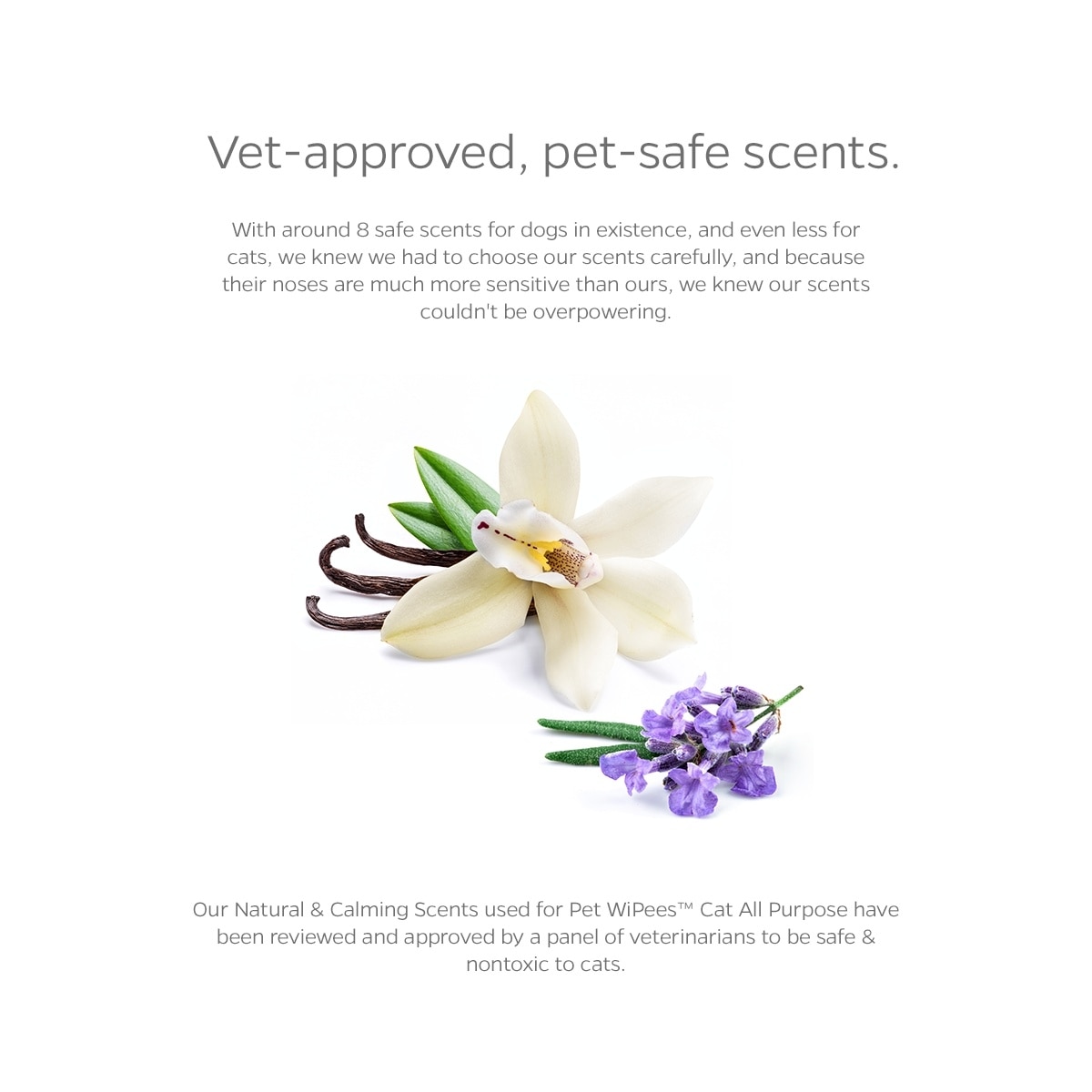 There’s only 5 pet-safe scents in the world for cats and only 7 for dogs. Further, our furbabies have over 100 million scent receptors to our 6 million, meaning their noses are way more sensitive to smells. Pet WiPees consist of two scents; Calming & Natural, both of which have been reviewed & approved by a panel of veterinarians to be pet-safe, non-toxic, & non-irritating for both dogs & cats, meaning our scents won't harm or irritate you or your furbaby's noses.