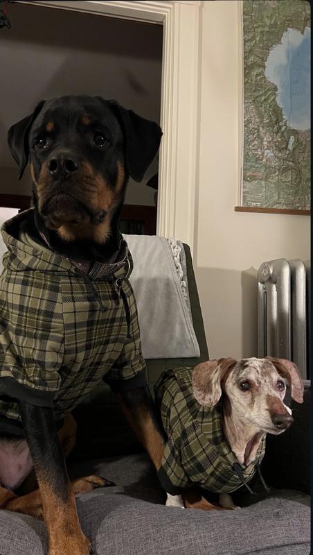 It’s difficult to find something that offers sizes for both my 12 pound dachshund and my 99+ lbs Rottie. These hoodies fit each of them perfectly.