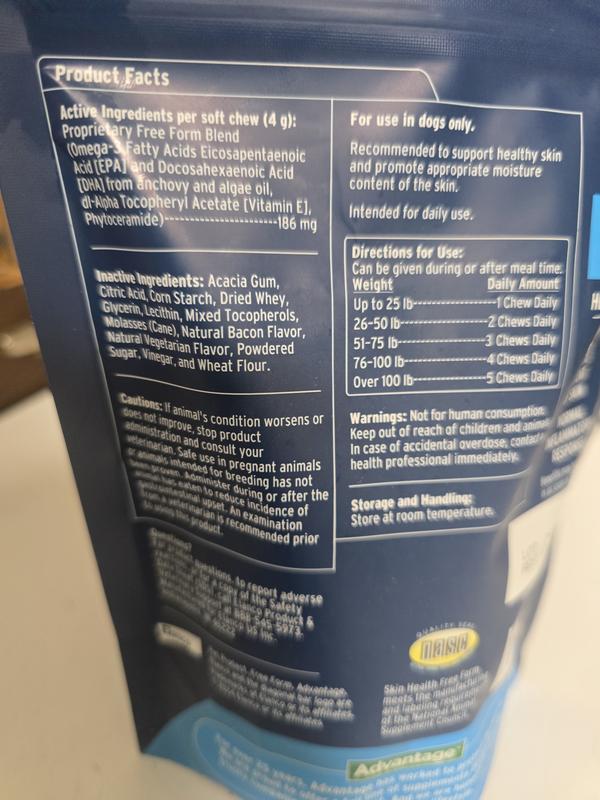 Skin Health Soft Chews for Dogs Great for dogs with sensitive skin, these skin health soft chews are made with omega-3 fatty acids (EPA & DHA), phytoceramide, and Vitamin E to support a healthy skin barrier. Plus, the bacon flavor makes them tasty for your dog and easy for you!