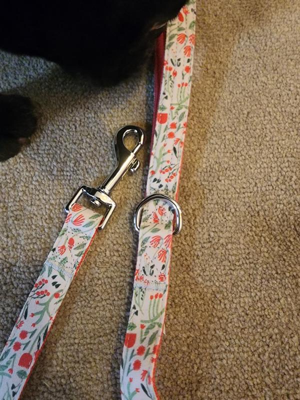 Really liked the look of the leash especially a female dog. Was sturdy and gave us a descent leanth @ 4.7ft think it could be a little longer @ 6 to 8 ft It’s a really pretty floral leash. Would definitely like to by a collar in the same color & flowers on it.