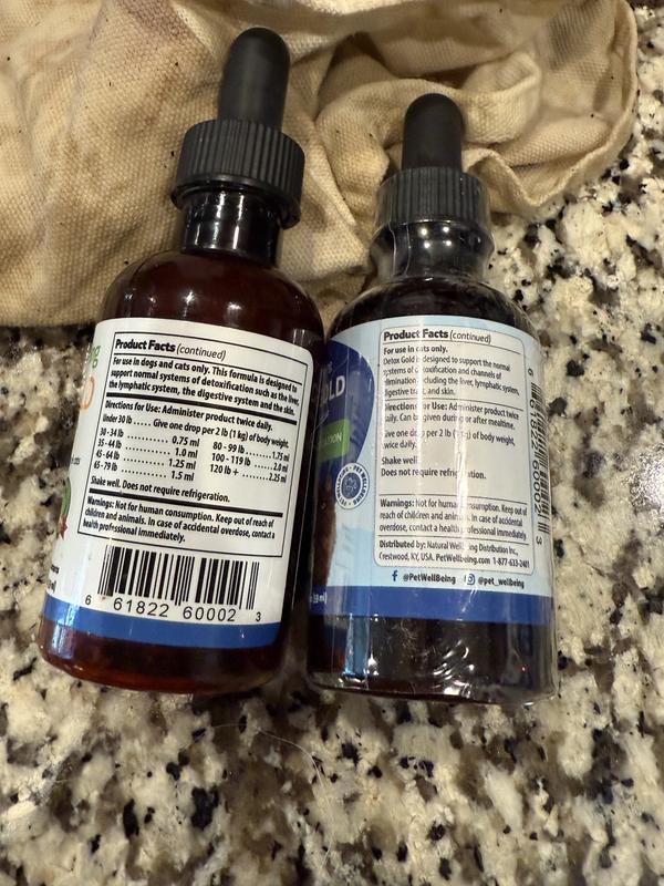 This Detox was for my 11-year old male cat, Edgar. He has hyperthyroid, kidney disease, tooth resorption, constipation, low appetite, weight loss, and his eyes weep all the time. I had previously tried many holistic things: holistic vet, acupuncture, homeopathy, flower essences, herbs, etc. Edgar receives Pet Well Being Kidney Support Gold, sub-q fluids, and methimazole for his thyroid. He had an energy session with a holistic practitioner. Her reading of Edgar revealed that he has allergies to some grasses/plants in our area, that he is toxic with silver and aluminum and that flame retardants in his cat bed were disrupting his thyroid. His eyes cleared up after her energy clearing session, but began weeping again a week later. I took away the cat bed. She suggested an herbal detox, homeopathy for weepy eyes, and fulvic minerals to heal his gut, and no more colloidal silver. He had this detox and fulvic for 3 months, and nothing has improved. I mixed it with his food, 4 drops twice per day. Pet Wellbeing is a good brand, but I believe his problems are far too many and beyond an herbal detox.