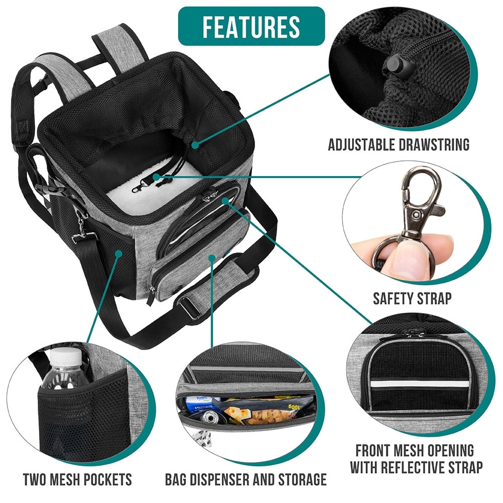 - Features multiple pockets, a poop bag dispenser, adjustable drawstring mesh top, and a reinforced bottom for convenience and security.
