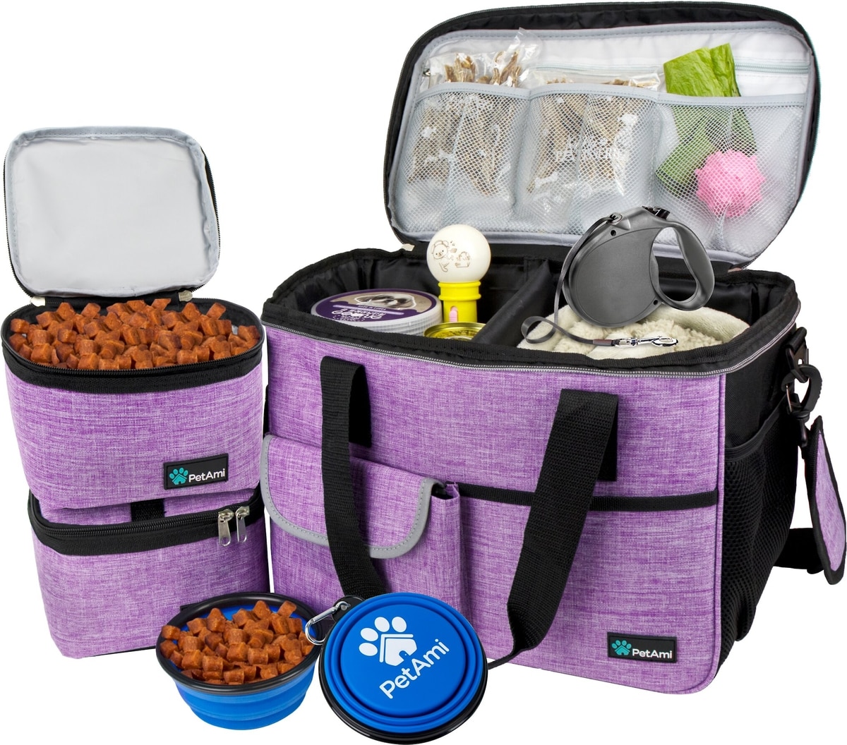 This travel bag comes with 2 food container bags and 2 collapsible bowls.