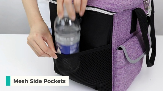 Pretty color (purple)! Good, functional pockets. Love the zippered square inserts which are also insulated and great for carrying hard food (which I keep in plastic bags) and meds that need to stay cool.