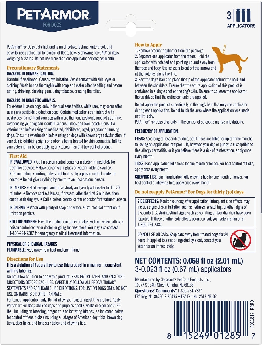 PetArmor Flea & Tick Spot Treatment for Dogs, 5-22 lbs, 3 Doses (3-mos. supply)