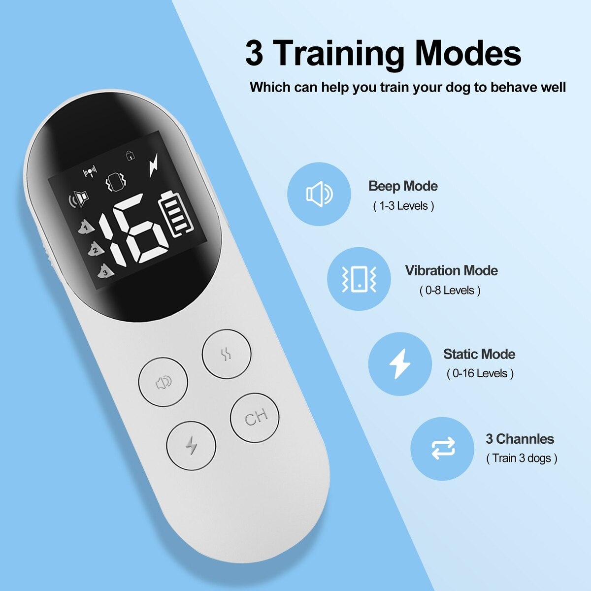 Each collar offers sound, vibration, and safe static stimulation with adjustable intensities—perfect for dogs of all sizes. Start with tone and vibration, and use static when necessary. This flexibility ensures positive, effective, customized training.