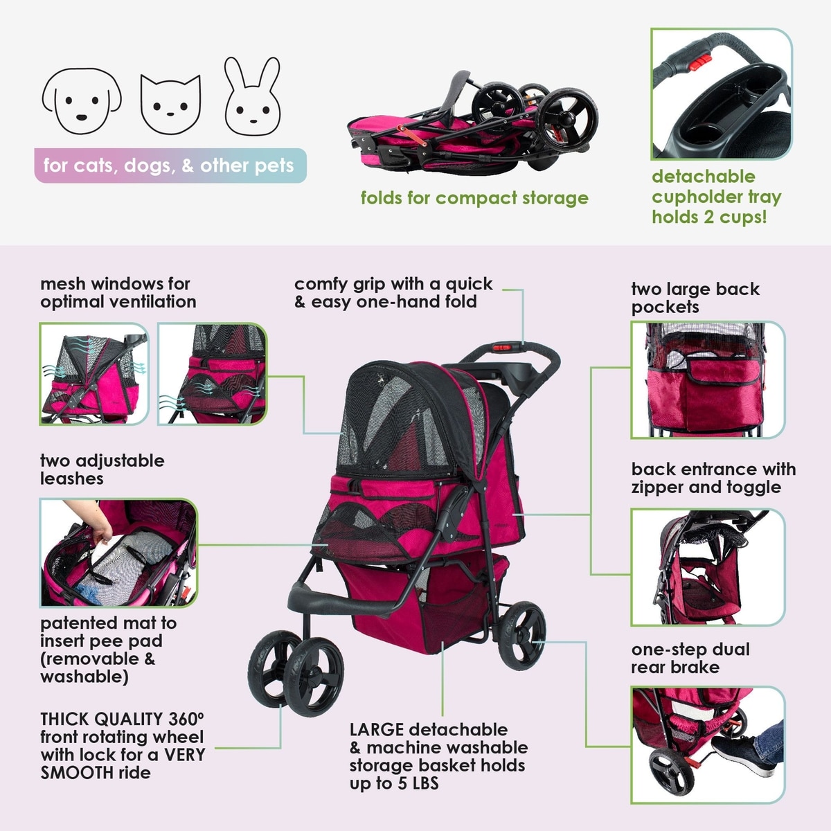 This stroller is perfect for my two siberian kittens! Even when they get older, I think this will still be big enough for both of them to fit. I like the size and shape of the stroller, it wheels smoothly on the street, and the pockets, storage bin, and cup holders are perfect for holding everything we need on a walk. The color is so vibrant and eye catching! We get stopped on every walk because people want to see the kitties in the stroller. My girls are becoming celebrities in our neighborhood!