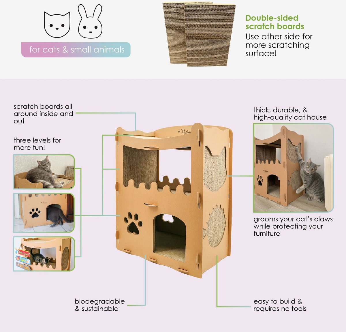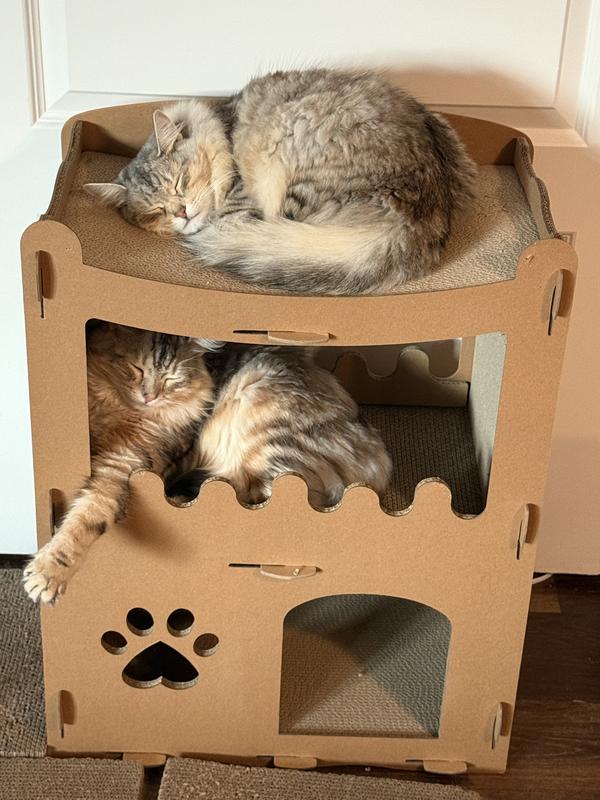 It's hard to find this shape of a cardboard house with multiple levels, not too wide/deep, and the cardboard surfaces for the cats to scratch while inside or outside. The only negative is that the cutouts on the side pieces don't allow access to the entire cardboard scratchers inside or out. The cutouts will be used up in no time. Other than that, the cats love this. Too small for two adult cats but they try anyway. Very comfortable for one adult cat per level.