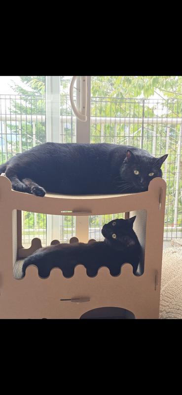 This was easy to put together and it’s fairly sturdy. I have a big kitty and he loves laying on the top floor, which is large enough for him to sleep comfortably. He also loves all the surfaces that have the scratcher material. The one negative that would be easy to remedy (by cutting one of the pieces) is that the two pieces used to create the floor for the second level did not fit together. I decided to only use one piece because it gives Charlie more room when he’s on the bottom and he can also get a full stretch when he wants to use the scratcher on the inside wall.